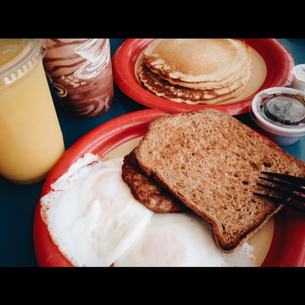Завтрак в аэропорту ???? Сок, кофе, яйца с тостами и «колбаса» (но для нас, европейцев, это похоже на котлету) и блины с кленовым сиропом, конечно.