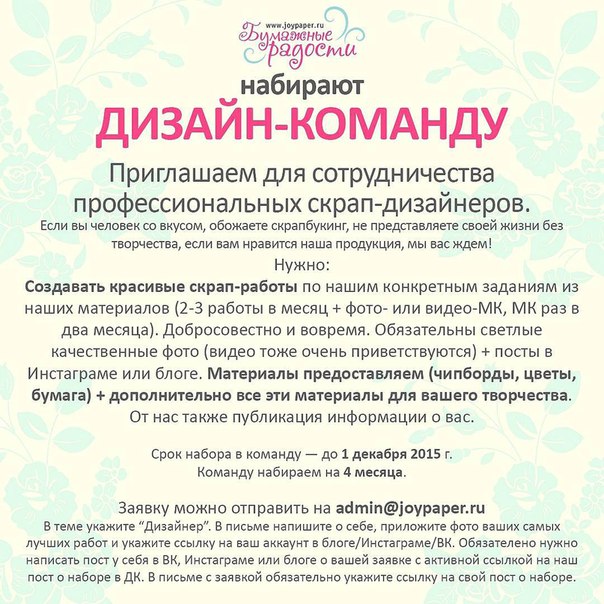 Все производители скрап-товаров время от времени ищут мастеров, которые бы создавали из их материалов всякие красивые штуки. Никогда не пыталась даже поучаствовать в таком конкурсном отборе, но сейчас подумала: почему бы не рискнуть? - И написала заявку в joypaper.ru. =) Как говорит прекрасная [id2600748|Жанна Хуснулина]: "Начинай делать до того, как будешь считать, что готов!" =)) Попробую сделать ещё шаг вперёд!