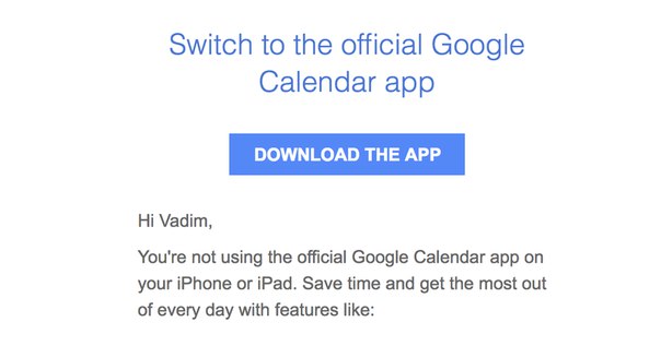 Вадим, на вашем iPhone или iPad не установлено официальное приложение Google Calendar, — пишет мне Google. Жду следующего письма, что трусы на мне сейчас наизнанку и кефир в холодильнике прокис. Я и так знаю, что они знают, но неприятно, когда об этом напоминают.