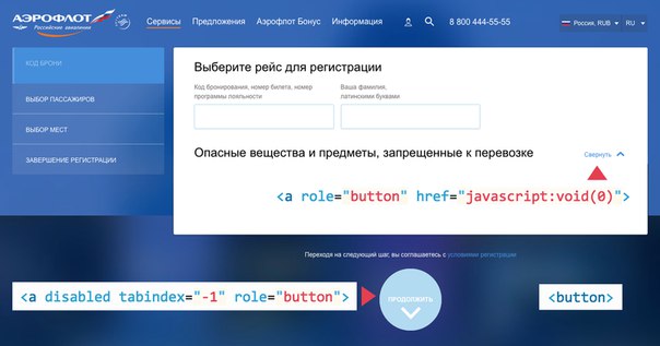 Аэрофлот пытается делать доступность: <a disabled tabindex="-1" role="button"> и <a role="button" href="javascript:void(0)"> вместо <button>