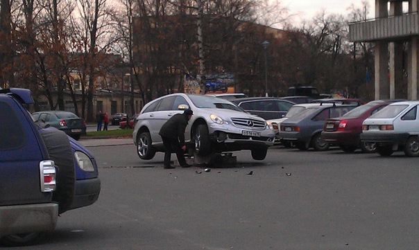 Был свидетелем просто виртуозной парковки -- вывесить аж три колеса на таком маленьком препятствии! Кто-то переоценил количество сантиметров в своем клиренсе:)