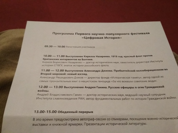 Внезапно, благодаря Андрею Ганину https://vk.com/id15935 (наконец, девиртуализовались!) пришла на фестиваль "Цифровая история" - такое мероприятие, где ученые-историки читают научно-популярные лекции о военно-политической истории России. Вообще, научно-популярных мероприятий последнее время стало много, и это, наверно, скорее, хорошо, чем плохо. Но меня все равно продолжает удивлять действительно кассовый формат происходящего. Например, на это мероприятие самые дешёвые билеты стоили 1800 рублей, а самые дорогие 3700. И зал таки заполнен! Типа людям не лень вместо театра или концерта прийти в субботу слушать лекции. Как мы живём, однако.