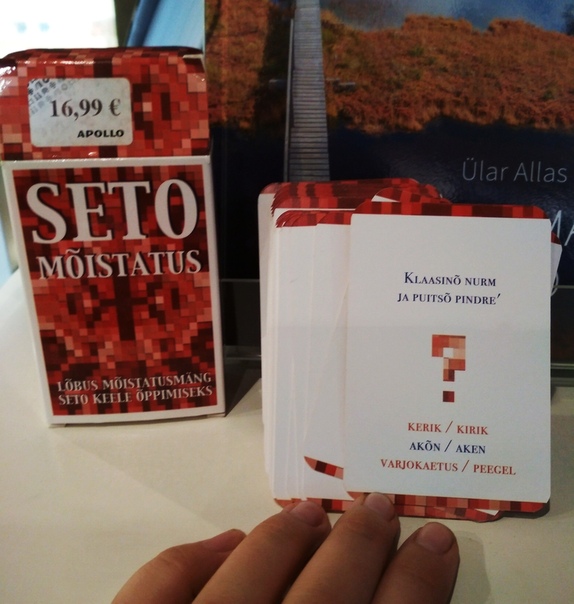Ой, чуть не забыла. Смотрите, это прямо очень круто: игра для изучения языка сету (южно-эстонский диалект, очень сильно отличающийся от литературного эстонского, на котором говорит народность сету на границе Эстонии и Псковской области) прямо в обычном книжном магазине в центре Таллина! Толстая колода карт, на каждой загадка (на языке сету) и варианты ответов (на сету и на эстонском).
