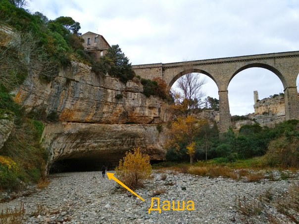 What else would you show from France ... That's how I have been in Spain for a long time (two whole days!), But I want to make my impressions in chronological order. Obviously, in France there are many more beautiful cities besides Carcassonne, but we went to rummage through the outskirts (it is hardly such a logic that will surprise anyone here, eh?), Moving down from the main highway and allowing a small highway to lead us to where. In the end, quite accidentally discovered a village called Minevr with an awesome viaduct through the gorge. The surrounding landscapes were formed by quite impressive canyons of rivers, but the rivers themselves, apparently, went into hibernation: there was no rough water below. We even went down to the canyon: right under the village there was a cave, which, judging by the Pont natural designation ("natural bridge") on the map, used to be the bottom of a river. Now it looks like some kind of Martian tunnel. You will look at the pictures, look for a black dot: this is Dasha. According to Dasha you can estimate the size of everything else.)