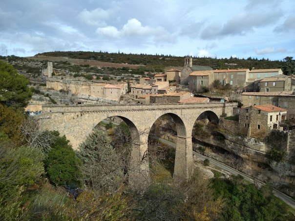 Что бы вам ещё из Франции показать... Так-то я давно уже в Испании (целых два дня!), но впечатления хочется укладывать в хронологическом порядке. Очевидно, во Франции есть много еще прекрасных городов помимо Каркассона, но мы поехали шариться по задворкам (вряд ли такая логика кого-то здесь удивит, да?), съехав с основной трассы и позволяя небольшим шоссе вести нас непонятно куда. В итоге совершенно случайно обнаружили деревушку под названием Миневр с офигенным виадуком через ущелье. Прилегающие ландшафты были сформированы довольно впечатляющими каньонами рек, впрочем сами реки, видимо, отправились в зимнюю спячку: внизу не было никакой бурной воды. В каньон мы даже спустились: прямо под деревней была пещера, которая, судя по обозначению Pont natural ("естественный мост") на карте, раньше была дном реки. Теперь же это похоже на какой-то марсианский тоннель. Будете смотреть фотки, ищите черную точку: это Даша. По Даше можно оценить размеры всего остального.)