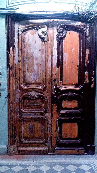 Это дверь из того самого дома. Лестница №2. 5 этаж, возле кв. 15. Значит, квартира 28. Из-под ободранной краски темно-пурпурного цвета вылезает витиеватая деревянная резьба, более чем роскошная для обычного дома в центре. Раздолбанная дверь может вести в коммуналку. Мы как раз только что глядели в окно на лестничной площадке. Сверху отлично видно напротив кухню с таким же кафельным полом и тремя газовыми плитами. А еще там шкафы и столы - в одной кухне.