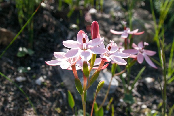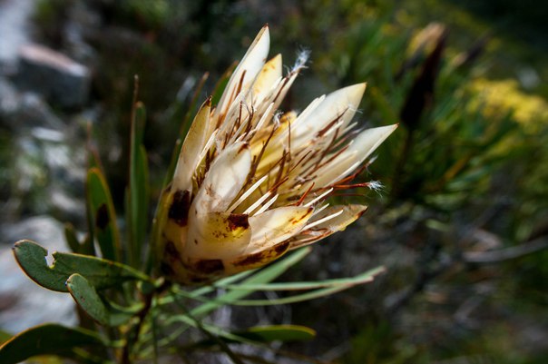 Я здесь практически об этом не писала, но, на самом деле, большую часть времени я провожу не в океане, а сопровождаю отца в его полевом выезде, можно сказать, ботанической экспедиции. Большую часть дня мы ходим по горам и собираем образцы растений для его научной работы. Наше рабочее место может выглядеть, как на первом и втором фото: горная долина, голубое небо, а вдали — океан, где периодически появляются киты (это такое специальное место, куда они любят заплывать), и поэтому если ты не смотришь под ноги на растения, то смотришь на океан в надежде их увидеть. По-моему, идеальнее места работы в природе не существует. :) Все склоны гор сейчас покрыты цветами, и я вдруг подумала, что возможно вам будет интересно посмотреть на некоторые африканские цветочки. Названиями мучить не буду, но возможно чей-то пристальный взгляд увидит здесь кофейно-молочный вариант вереска и гигантскую росянку, а также дикий ирис.