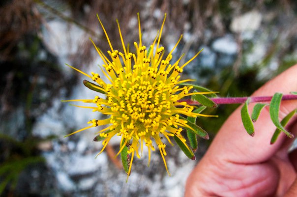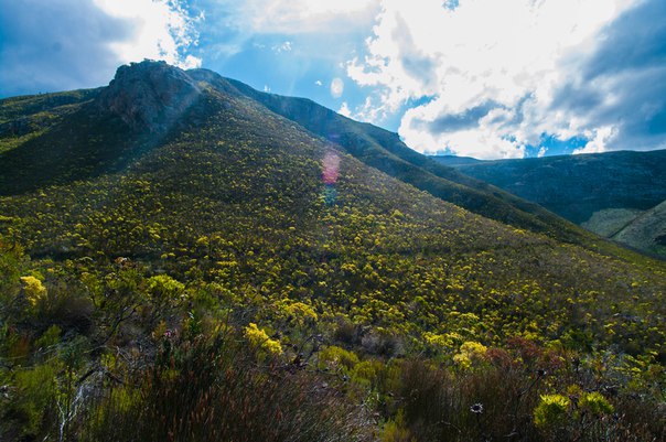 I didn’t write about it here practically, but in fact, I spend most of my time not in the ocean, but accompany my father on his field visit, a botanical expedition, one might say. Most of the day we go through the mountains and collect samples of plants for his scientific work. Our workplace may look like the first and second photo: mountain valley, blue sky, and in the distance - the ocean, where whales periodically appear (this is a special place where they like to swim), and therefore if you don’t look at your feet at the plants then you look at the ocean in the hope of seeing them. In my opinion, the ideal place to work in nature does not exist. :) All the mountain slopes are now covered with flowers, and I suddenly thought that it might be interesting for you to look at some African flowers. I will not torment with names, but perhaps someone’s gaze will see here a coffee-milk version of heather and a giant sun-tree, as well as a wild iris.