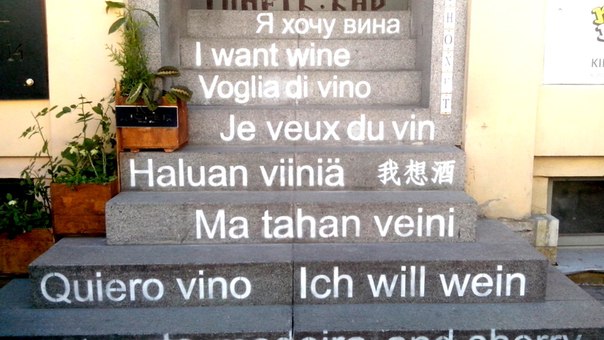 I found a drinking establishment, the steps to which reflect the content of my brain for the last month and a half. I really want wine. I want wine in all the languages of the world, but I don’t know everything. Even on the steps, I do not know everything (but by the way almost everything except Italian and Chinese, there is even Estonian there). So here. Scary want wine, but I can not. I take pills.