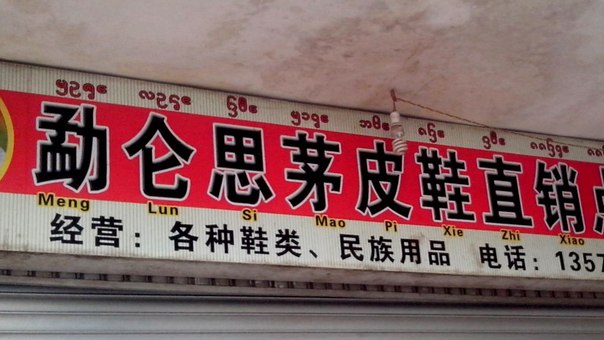 Еще тут новый язык появился. В добавление к китайскому практически все надписи продублированы няшными закорючками, см. 1 картинку (знатоки спросят, не бирманский ли - нет). Это язык лы. Народ дайцы, а язык лы. Точнее, народность тоже лы, подвид дайцев. Разные дайцы на разных языках говорят (востоковеды в ленте, как вы с этим разбираетесь, я вечер потратила, чтобы понять, какой язык именно в этом месте, у всех языков куча дополнительных названий, каждое из которых похоже на "тай"), но в Сишуанбаньна именно лы.