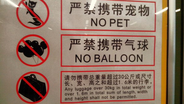 Alcohol, cats and balloons cannot be carried on the subway. Almost Singapore. ;)