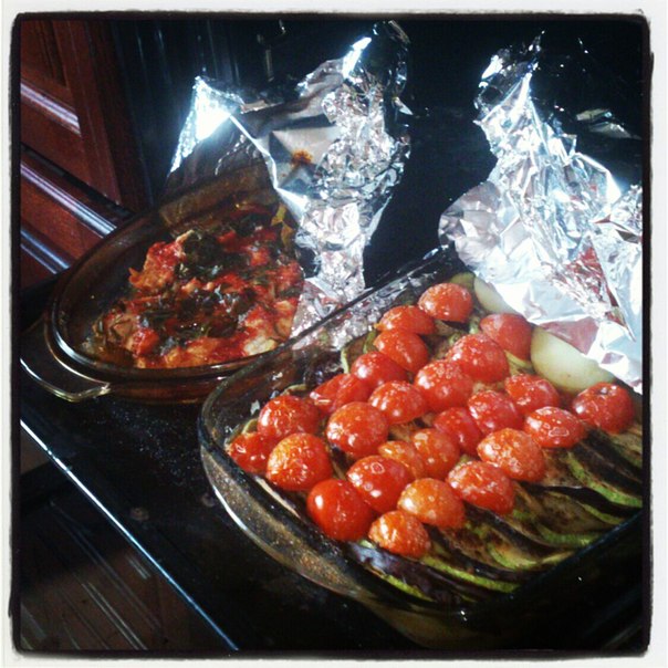 Вариация рататуя на луковой подушке и куриные грудки под соусом из протертых помидорок с чесноком и петрушкой.