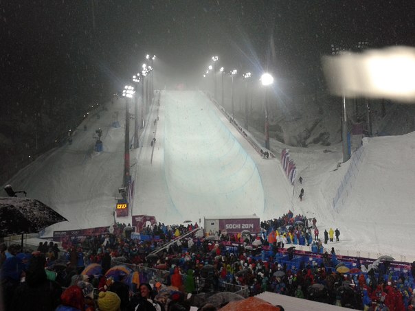 Сегодня действительно тяжелый день: две поездки в горы, затем обратно на морское побережье для поддержки нашей хоккейной команды и, наконец, завершение дня с триумфом США на лыжном хафпайпе в Экстрим-парке! Даже ужасная погода не могла остановить нас!