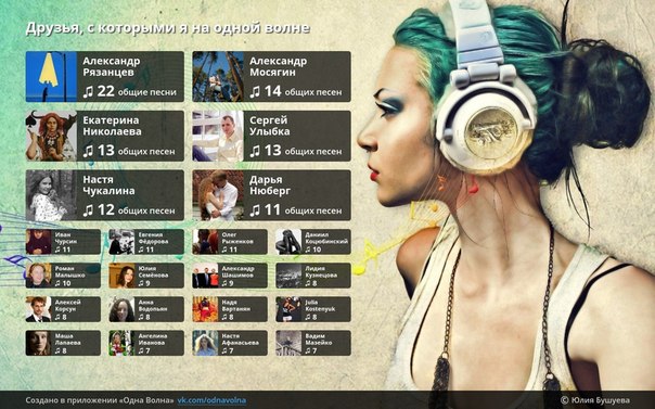Analysis of the music showed who I am on the same wavelength :) The results in the picture. Curious? Run: vk.com/odnavolna#?u=8097