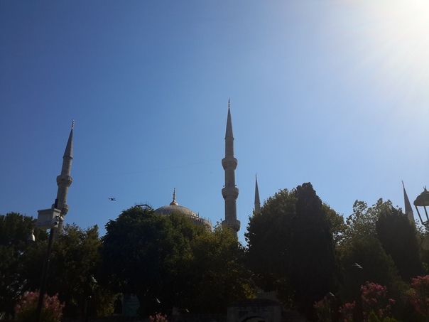 Напротив Святой Софии, на другом конце площади Султанахмет располагается одноименная мечеть, построенная в начале XVII в. Это символ Стамбула — прекрасная мечеть посреди пышного сада с фонтанами и лужайками. Ее архитектор решил превзойти соседнюю Айя-Софью не в размерах, а в изяществе форм. В результате мечеть Султанахмет получила целую россыпь куполов и стала одной из немногих в мире мечетей с шестью минаретами. В народе мечеть прозвана Голубой благодаря использованию в интерьере более 20 тыс. керамических изразцов ручной работы голубого и белого цветов. Центральный зал размером 53 х 51 м. накрыт куполом диаметром 23,5 м. и высотой 43 м. Кстати, высота купола Айя-Софии - 55 м., диаметр 31 м.