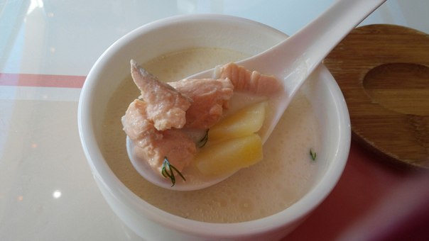 В качестве первого блюда взяла сливочный суп с лососем и треской.Трески было чуть,почти незаметно (что отлично) , сам суп,ясное дело, не финский жирненький лохикейтто,но для супа как перекуса после салата-вполне.На второе была просто восхитительная, воздушная, нежная котлетка из трески. Пюре было картофельным,но вот горошек его подпортил, хотя сама котлетка была так вкусна,что пюре было не так важно: )