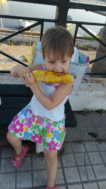 Вся набережная в нашем Пальо Фалиро утыкана киосками, в которых жарят свежую кукурузу, иногда вместо обычной бумажки, её в этот же зелёный лист и заворачивают...Романтика за 1,5 евро штучка (холодной зимой дешевле: 1 евро)