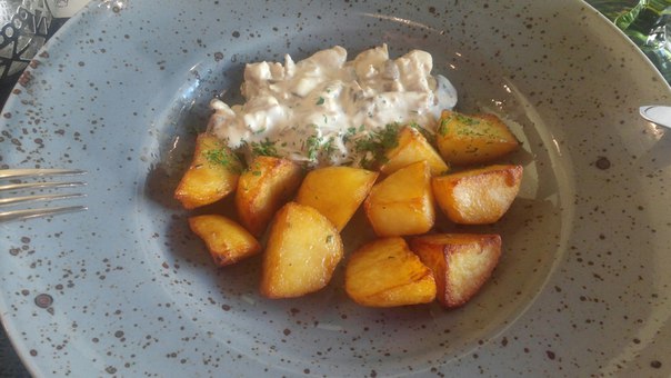 Then it was possible to choose from tomato soup (which tomatoes in our area in March?) And mushroom with pearl barley. Thinking that the mushrooms would be clearly not the first freshness, and even with the hated pearl barley, I looked at the second. The second was fricassee with baked potatoes. Fricasse turned out to be slices of chicken in a creamy sauce and with just fried potatoes, but slices, and not like fries at McDonald's.