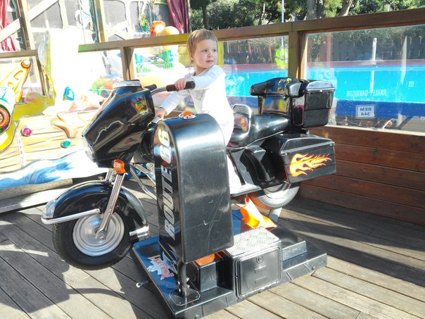 Nikulka, like many children, loves all sorts of different techniques, buttons, cars, airplanes, now do not go past a small amusement park in our marina. She was very attracted to the carousel and motorcycles.