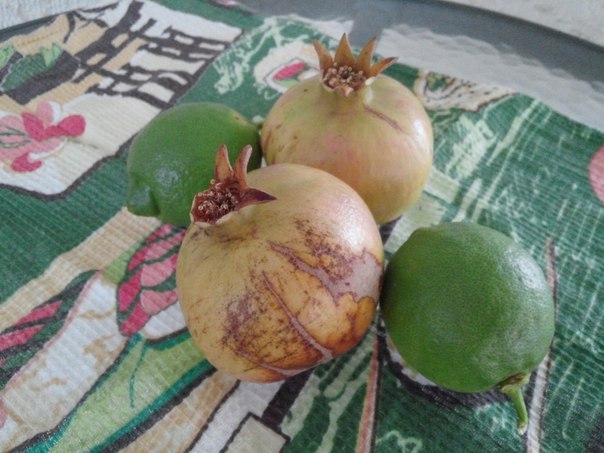 Лимоны зелёные, но их приятно класть в чай:дают кислинку и терпкость,гранаты,конечно, не самые вкусные, но забавно, что можно спустится в сад и их сорвать