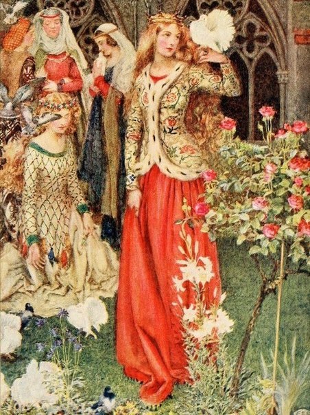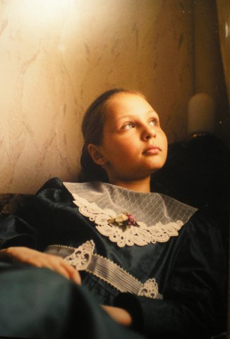 Моя ученица танцует, поэтому её часто можно видеть в необычных костюмах. Вижу её в платье, подобном тому, как у коронованной девы на картине. Спрашиваю: "Что это за костюм? Кого вы танцуете?" Ребёнок опускает ресницы и царственно оглядывает себя (на ней платье красного бархата с воздушным золотым подолом, с прозрачными золотыми рукавами и стоячим мерцающим воротником; при движении блёстки сыпятся с неё, как листопад осенью; несколько из них прилипли ко лбу, щекам и светятся).