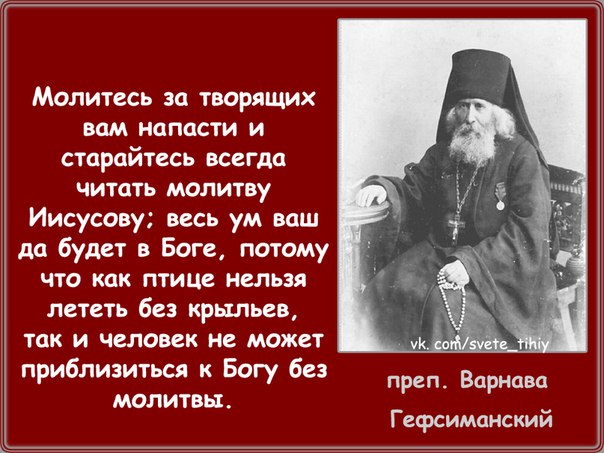 Holy Hesychius of Jerusalem (The Word of Sobriety): He who does not have prayer, is pure from thoughts, does not have a weapon for swearing: I am talking about prayer that works in the interior of the soul, about prayer in which the adversary who secretly defeats and scorches (Chap. 21); It is impossible to cleanse the heart, and drive away hostile spirits from it without frequent invocation of Jesus Christ (chap. 28); How impossible it is to lead an earthly life without food and drink: it is impossible without attaining sobriety and purity of heart, what sobriety is and what is called sobriety, to reach the soul into something spiritual, or to free oneself from mental sin, even if someone with fear of eternal torment forced do not sin yourself (ch. 109). If you really want to shame your thoughts that are chilling you, to keep silent in the soul world, to be sober (awake) with your heart: then Jesus prayer will unite with your breath, and you will see this happen after a few days (chap. 182); It is impossible to sail a ship without water: and the observation of the mind cannot take place without sobriety, combined with humility and with the unceasing prayer of Jesus (ch. 168). If you have a desire for the Lord, not only present yourself as a monk and good, and meek, and constantly united with God, if you have a desire to be truly such a monk: pass through the virtue of attention, which consists in keeping and observing the mind, in performing heartfelt silence, in a blissful state soul, alien to reverie, which is not found in many (ch. 115). Truly and essentially a monk is the one who corrects sobriety: and he truly corrects sobriety, who in the heart is a monk (solitary) (ch. 159).